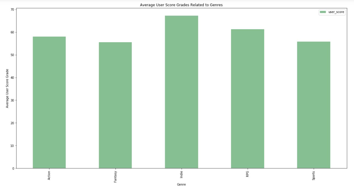 - The bar plot above represents the average user score grades given in each genre specified for all PS4 video games. Indie appears to have the highest grade among user scores, compared to that of fantasy for example. Action is surprisingly a bit lower for user score grades, but that could be because there are so many more action games than indie games, and therefore the user is more critical of a grader.