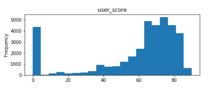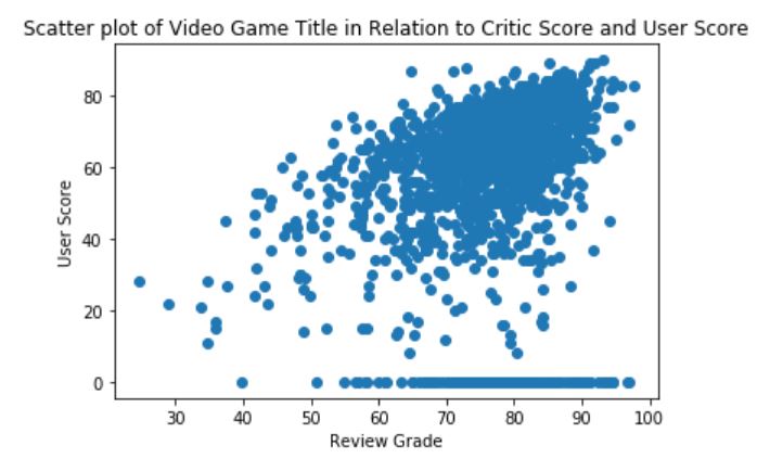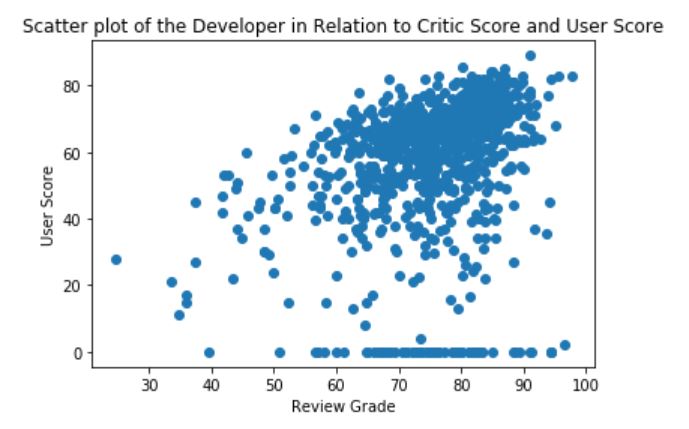 - The histogram above represents the average reviews for video games related to the user scores opinion. It is shown that the user score is a bit more tough when grading video games, with scores ranging more so in the 60s to the 70s. There are also several games that do nit have a user score rating, as they are marked with a 0 towards the left of the histrogram.