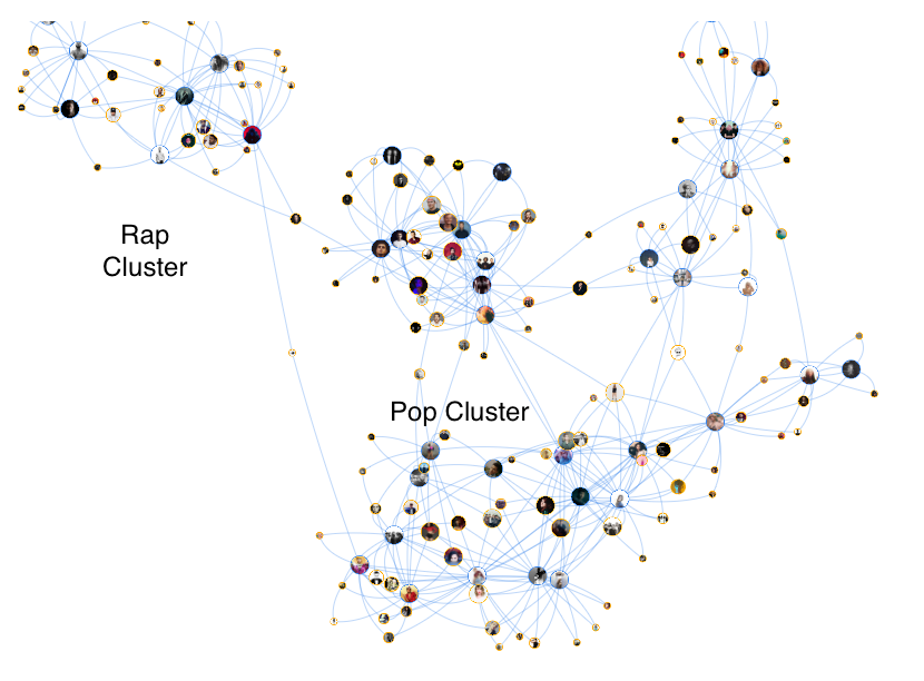 Finally, a clustering algorithm could be used to identify sub-genres in the artist network.