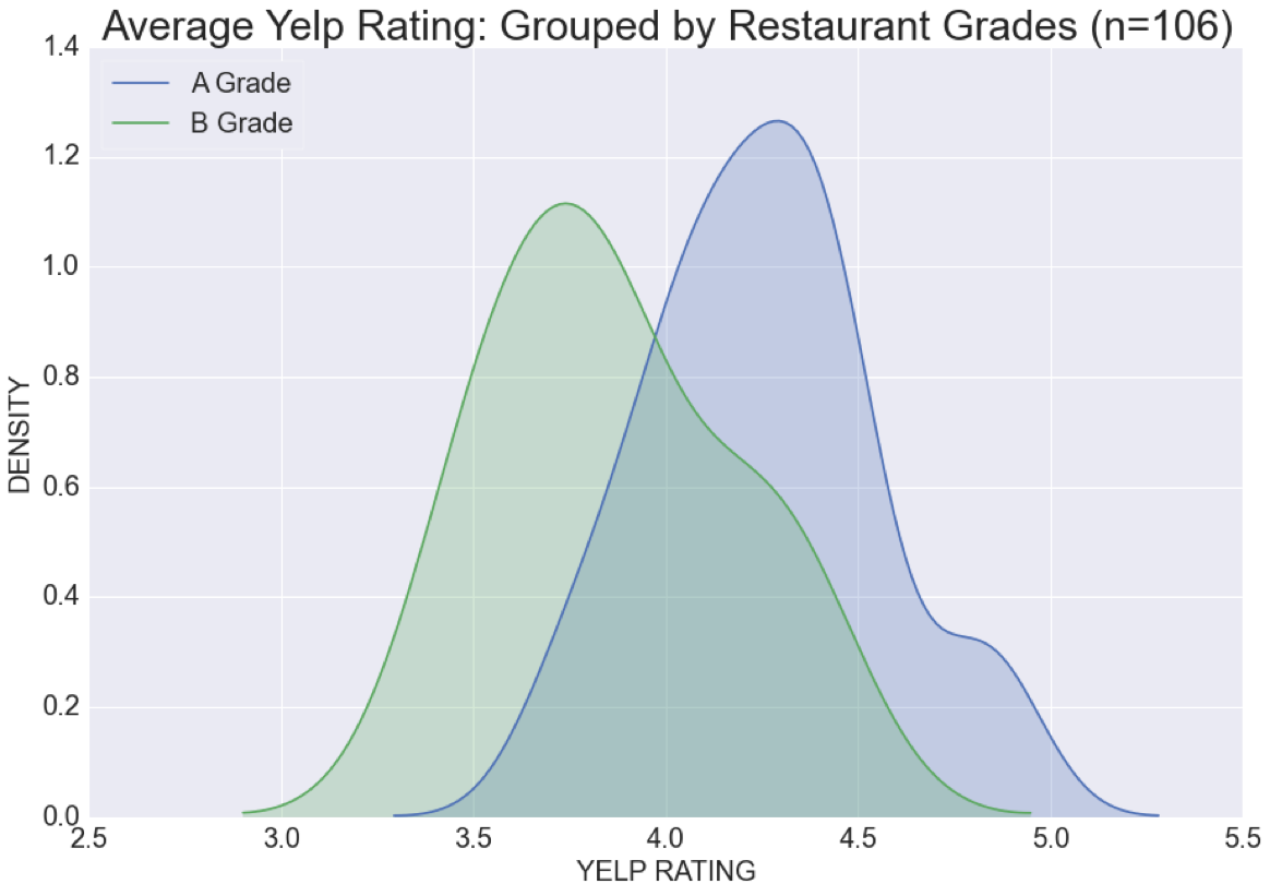 - Using 106 restaurants as a sample size, these results show that restaurants with higher restaurant grades (administered by the NYC DOH) tend to have higher restaurant ratings. The graph below shows that B graded restaurants have an average rating of 3.7 whereas A grade restaurants have an average rating of 4.25.