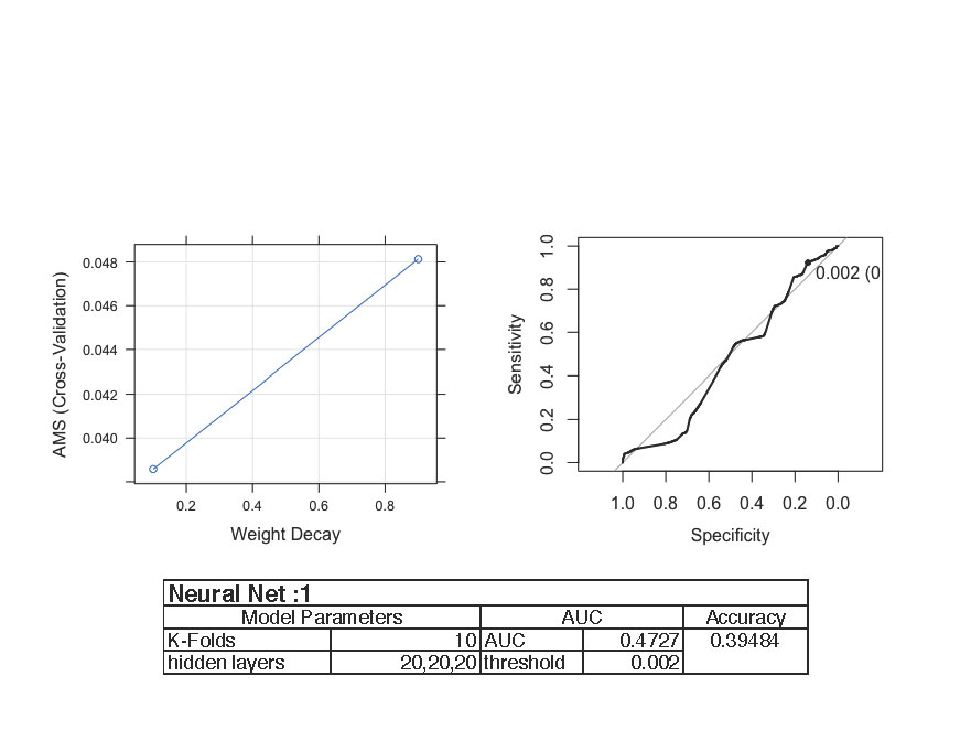 Playing with the model and actually getting it to a good fit are two completely different concepts. In general, we split the training set: 80% of the training set to train the model, and the remaining 20% as a test set. In all cases we used the AMS as the deciding metric, and measured accuracy as the percentage of the 20% test data correctly ID’d as our performance indicator.