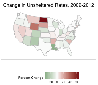 The unsheltered homeless population is the number of people sleeping on the streets on a given night, and is, at best, an estimate. However, some states saw significant shifts in the percentage of the homeless population that went unsheltered, with North Dakota’s unsheltered rate rising a troubling 60 percentage points. This aligns with reports of surging rent in light of bubbling populations, as people flood into North Dakota looking to work in the growing oil industry. Conversely, Louisiana’s unsheltered population dropped by over 20 percentage points, as more years separated the healing city from the devastation of Hurricane Katrina.
