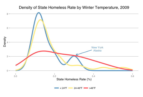 The density plot on the right depicts that cold and moderate temperature states have similar distributions of homeless rates, while warm states have a greater distribution of rates. New York and Alaska stick out as having discernibly higher homeless rates than other cold weather states, skewing the distribution to the right.
