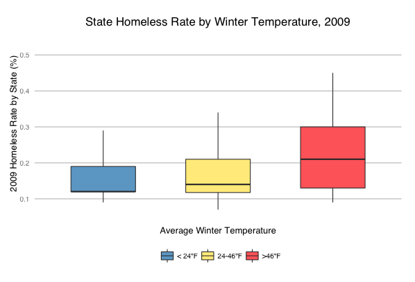 # Boxplot of homeless population and winter temperature bp1 <- ggplot(data, aes(Wtemp, Homeless2009, fill = Wtemp)) + theme_hc() + geom_boxplot(outlier.colour = NA, width = .75) + scale_y_continuous(limits = c(0, 150000)) + geom_text(aes(label=ifelse((Homeless2009>5*IQR(Homeless2009)),State,""))) + scale_fill_manual(values = c("skyblue3", "lightgoldenrod1","indianred1"), name="", labels = c("< 24ºF", "24-46ºF", ">46ºF")) + xlab("Average Winter Temperature") + ylab("2009 Homeless Population by State") + ggtitle("State Homeless Population by Winter Temperature, 2009") + theme(legend.position = "bottom", axis.text.x = element_blank(), axis.text.y = element_text(size=10), axis.ticks = element_blank(), axis.title=element_text(size=12), title=element_text(size=14), legend.text = element_text(size=10)) bp1 # Density plot of homeless rates l1 <- ggplot(data, aes(HomelessRate2009, color = Wtemp)) + geom_line(stat = "density", size = 2) + scale_color_manual(values = c("skyblue3", "lightgoldenrod1","indianred1"), name="", labels = c("< 24ºF", "24-46ºF", ">46ºF")) + scale_x_continuous(limits = c(0, 0.6)) + xlab("State Homeless Rate (%)") + ylab("Density") + ggtitle("Density of State Homeless Rate by Winter Temperature, 2009") + annotate("text", x = .42, y = 2.85, label = "Alaska", size = 4, color = "skyblue3", face = "bold") + annotate("text", x = .42, y = 3.3, label = "New York", size = 4, color = "skyblue3", face = "bold") + geom_segment(aes(x = .39, y = 2.9, xend = .31, yend = 2.2), arrow = arrow(length = unit(0.3, "cm")), color = "skyblue3") + theme_hc() + theme(legend.position = "bottom", axis.text=element_text(size=9), axis.title=element_text(size=13), title=element_text(size=14), legend.text = element_text(size=10)) l1
