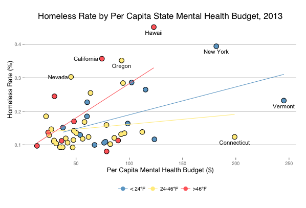 p1 <- ggplot(data, aes(Budget2012/StatePop2013*1e6, HomelessRate2013)) + geom_point(size = 5) + geom_point(aes(col = Wtemp), size = 4) + scale_color_manual(values = c("skyblue3", "lightgoldenrod1","indianred1"), name="", labels = c("< 24ºF", "24-46ºF", ">46ºF")) + theme_hc() + ylab("Homeless Rate (%)") + xlab("Per Capita Mental Health Budget ($)") + ggtitle("Homeless Rate by Per Capita State Mental Health Budget, 2013") + geom_text(aes(label=ifelse(HomelessRate2013>.4 | Budget2012/StatePop2013*1e6 > 150, State,""), vjust = 1.75), size = 4) + geom_text(aes(label=ifelse(HomelessRate2013>.3 & Budget2012/StatePop2013*1e6 < 80, State,""), hjust = 1.15), size = 4) + geom_text(aes(label=ifelse(HomelessRate2013>.35 & HomelessRate2013<.356, State,""), vjust = 1.75), size = 4) + geom_smooth(method=lm, se=FALSE, aes(color = Wtemp)) + theme(legend.position = "bottom", axis.text=element_text(size=9), axis.title=element_text(size=13), title=element_text(size=14), legend.text = element_text(size=10)) p1