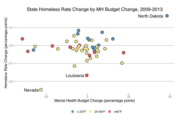 Changes in mental health spending and homeless rates from 2009 to 2013 show modest changes in homeless rates. Despite huge increases in menthal health spending, North Dakota's homeless rates continue to rise. Nevada, on the other hand, decreased it's spending and yet saw a reduction in homeless rates. Unfortunately, more current data show that that trend didn't last. Louisiana also saw a decrease in homeless rates with virtually no budgetary change, again, likely due to other services aimed to support those affected by Hurricane Katrina.