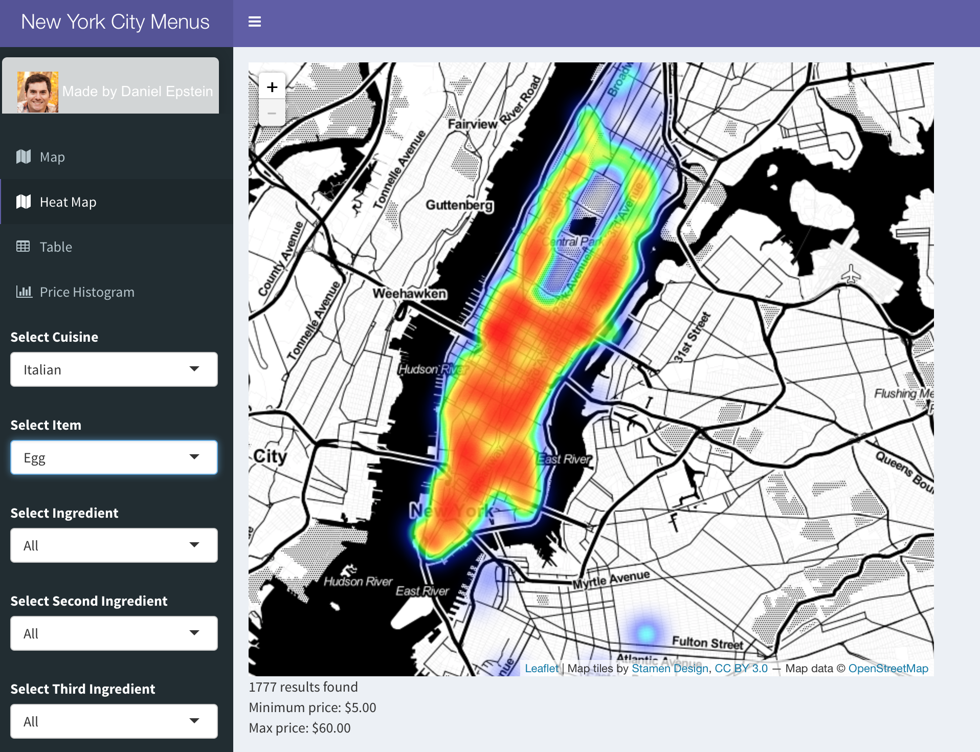 Restaurant reviews are extremely common and used frequently by users to find restaurants with good reviews near them. Yelp, Urbanspoon, and Zomato are just a few of the popular apps and websites that aggregate reviews. However, these sites, while incredibly useful and popular, could do a better job of providing insights into individual menu items. What's good, what's overpriced, and where to find it. I wanted to create a way to search by menu item and see prices, information and location. I scraped menus from the website Allmenus.com using Scrapy, providing me with menu items, prices, and descriptions, along with the locations and names of the restaurants. After data cleaning and removing lower priced items like beverages, I was left with about 500,000 menu items, mostly contained to Manhattan. From there, I created a map in shiny using R and leaflet that allows the user to filter by cuisine and more interestingly, by ingredient and even cooking method.