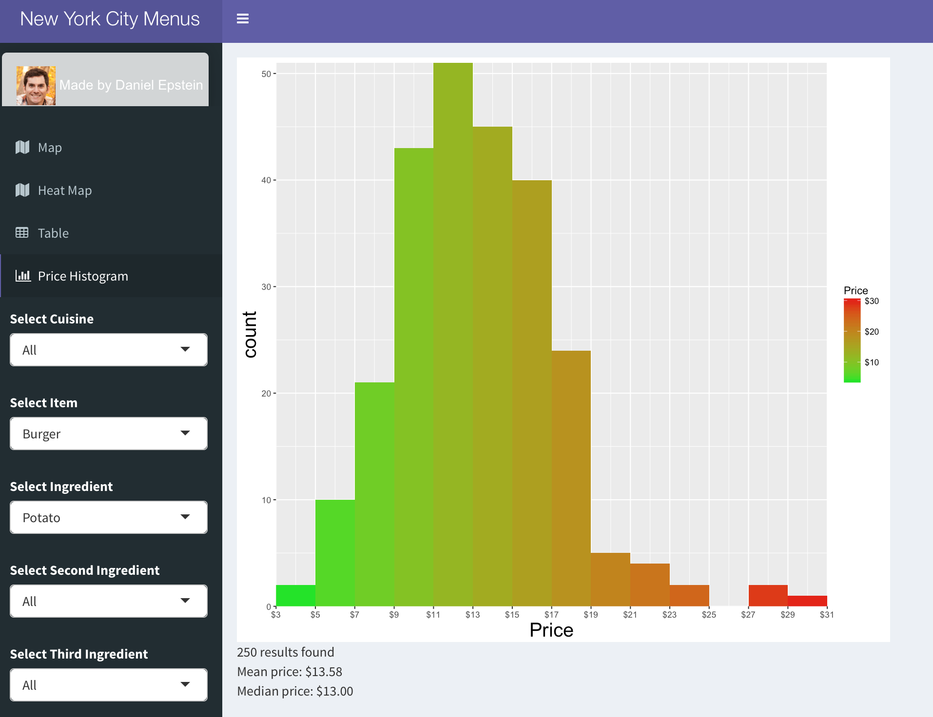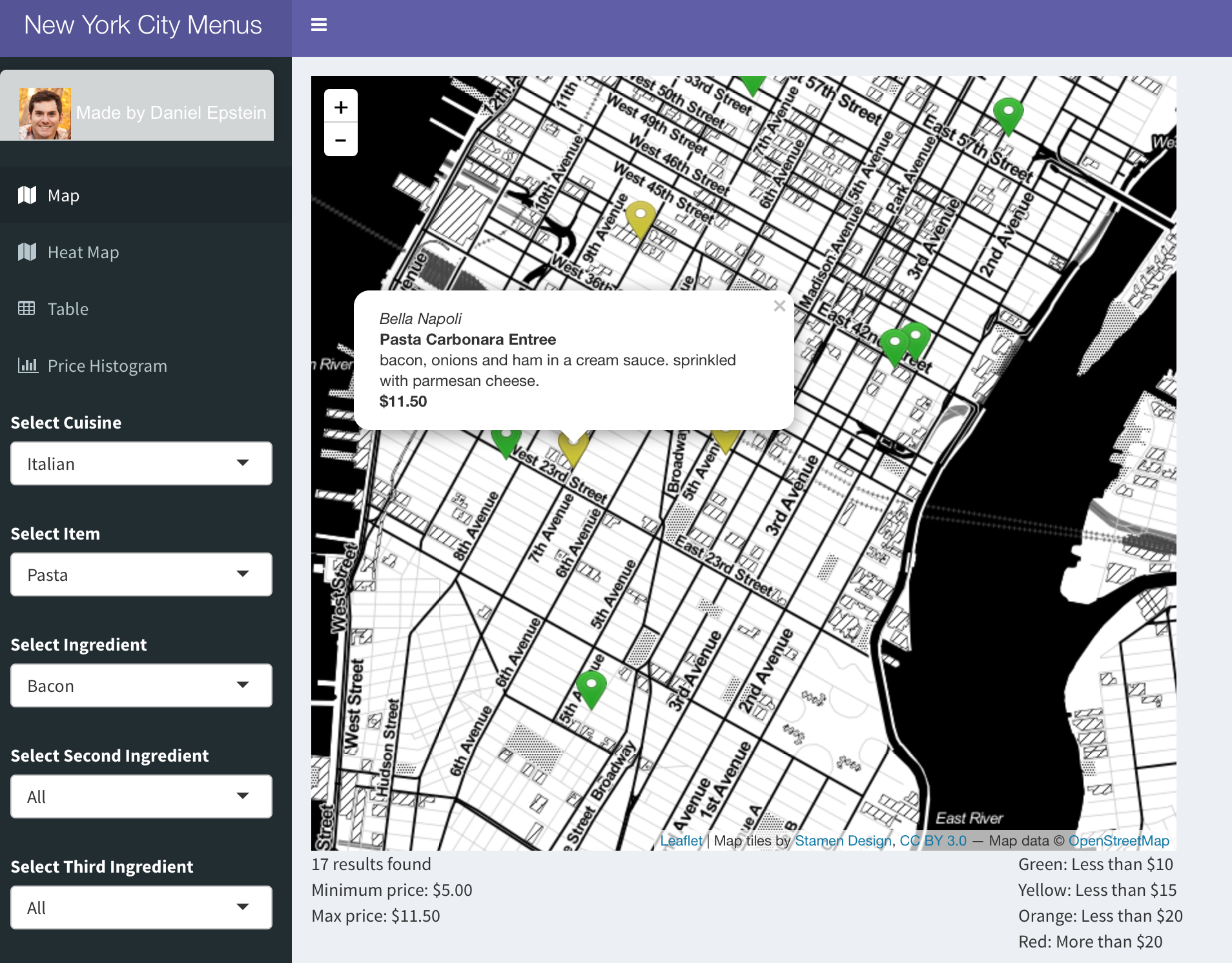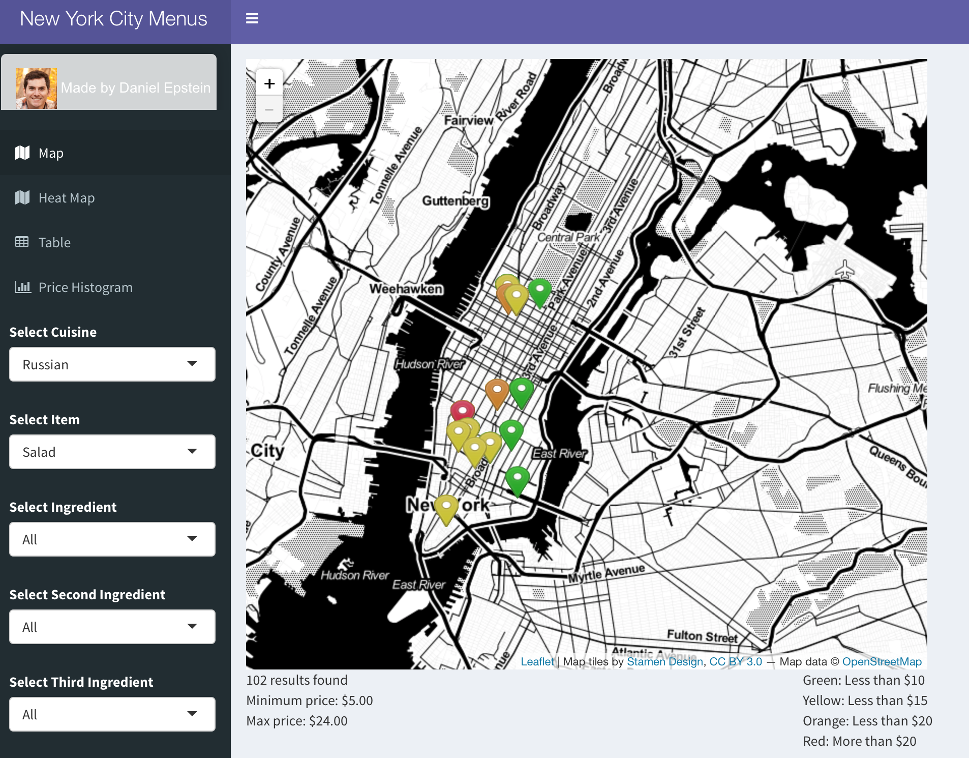 On the map, there are markers colored by the price of the item, Green for items less than $10, yellow less than $15, orange less than $20, and red for items that cost over $20