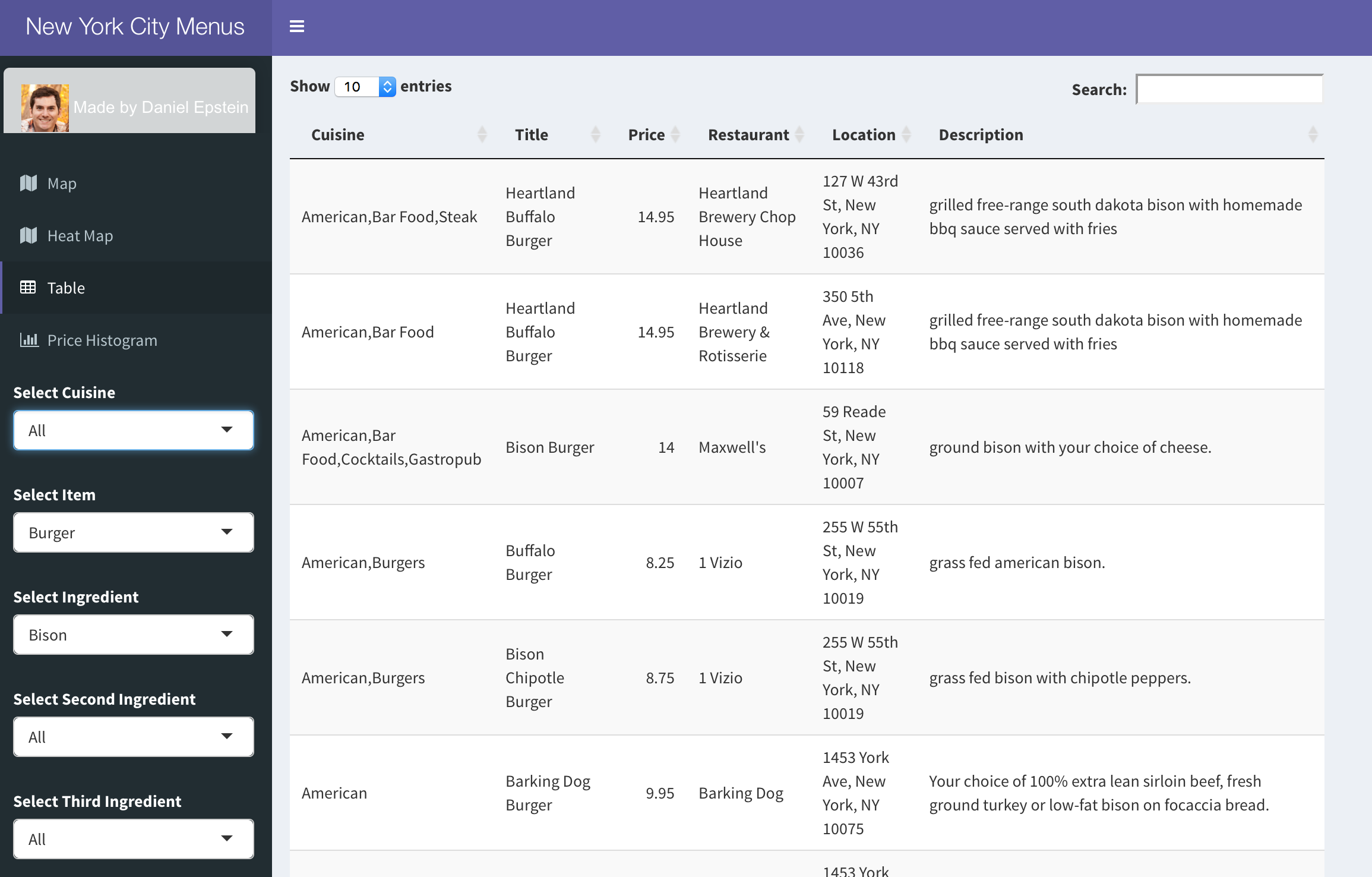 Additionally, there is a table tab, so users can see the database the map is pulling from. Using this they can sort by price, the name of the item or restaurant, or by location.