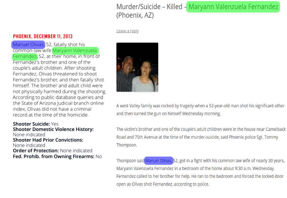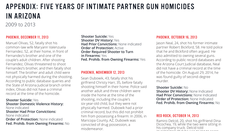 One source of information about IPV that I found was Everytown for Gun Safety, and while researching that group I encountered a study in the form of a census on domestic violence that involved gun homicides in Arizona from 2009 to 2013. The PDF for that study has an appendix with 100 IPV instances, and each instance contains a summary of the occurrence as well as classifications of the instance like whether it involved a shooter suicide or a shooter with a history of domestic violence. I wanted to use these classifications as the responses for the models that I would build using NLP.