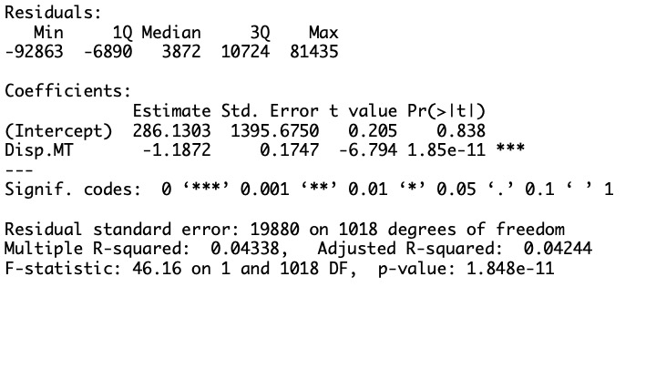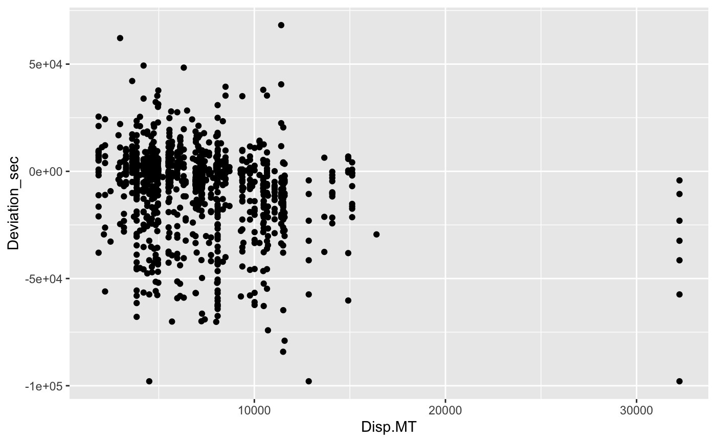 Though there is a large amount of variation, there does appear to be a relationship between disp.MT, LOA and the deviation time. We examined a linear regression model using both disp.MT and LOA, but found LOA was not significant (p<0.05) so we developed a model using only disp.MT.