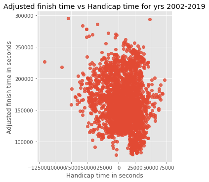 We used the Selenium scraping library to gather race times over the period 2002 to 2019 from the Bayview Yacht Club race site. We gathered identifying information for each boat, as well as the elapsed time and adjusted time. From those latter two quantities, we calculated the handicap time applied to obtain the adjusted finish time. An initial visualization of the adjusted finish time as a function of the handicap time yielded no insights.
