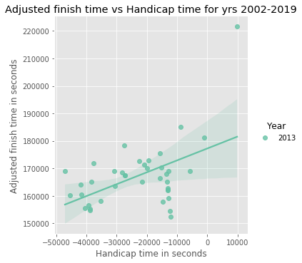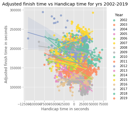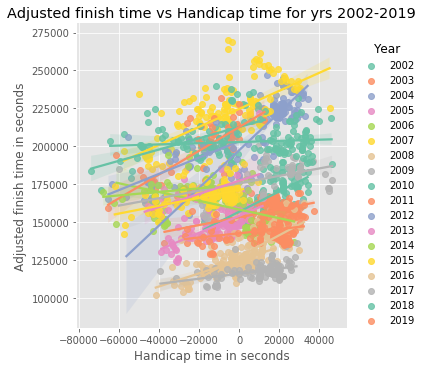 As we begin to examine specific years, we see a more marked relationship between the handicap and the adjusted finish times, with the times of faster (negative handicap) sailboats not being adjusted upward enough to compensate for their intrinsic advantages. The strength of the trend varies, as can be observed in the charts below.