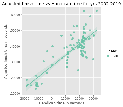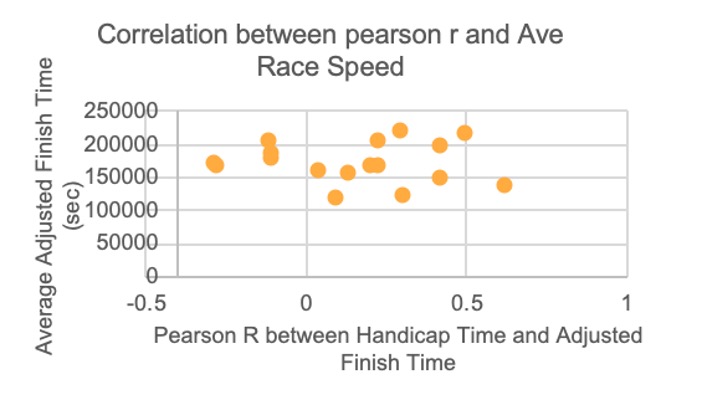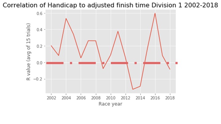 We examined the correlation between handicap time and the adjusted finish time as measured with Pearson’s R over the years of the race.