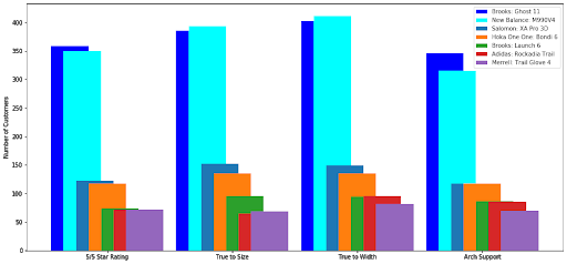 Figure 5 is a bar chart of the top 5 running shoe models and displays the 4 categories of ranking; 5/5 star rating, true-to-size, true-to-width, and arch support. These results are a weighted average of the number of customer reviews. We can see there are really only 2 top running models. Top ranked is Brooks Ghost 11, and Second is the New Balance M990V4.