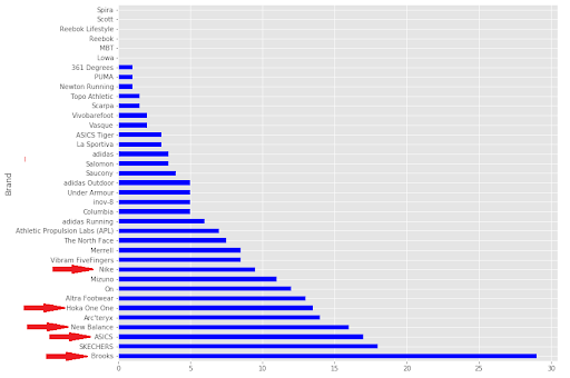 Zappos has a plethora of running shoes and many different ratings systems. They offer written customer reviews, overall shoe rating, total number of customer reviews, favorite likes, true-to-size feeling, true-to-width feeling and arch support. With all of these different ratings I was curious to find out which were the top brands and models. What do customers have to say about the highest rated shoes? What makes a running shoe stand out from the rest? Is it style, traction, light weight, price, fitment, or just plain comfort? Before we get to the results, let’s take a look a my method for scraping.