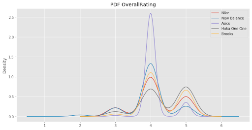 Immediately we see Asics stands out with a large peak in the 4/5 category however, falls short in the 5/5 star category. Weighing in both 4 and 5 star categories all 5 brands are close, but we can see the winner is Nike.
