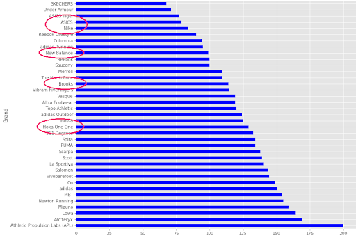 We see from figure 3(a) that all top 5 brands price point fall in the middle to lower range. We can conclude that the average runner cares about quality but only within a certain price range.