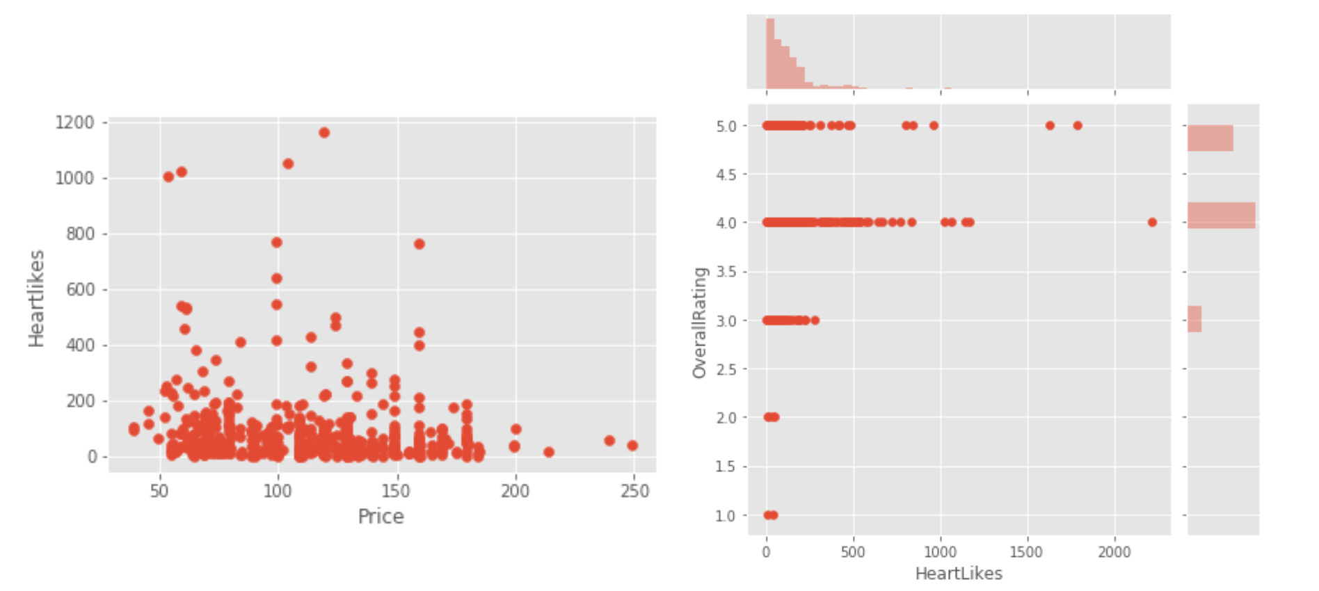 Figure 4(a) is a scatter plot of likes vs price. We notice the highest number of likes, in the 1000+ range, are the in the price range of 50$ to 125$. Figure 4(b) is a scatter plot of overall rating vs likes. We see this plot verifies our intuition that likes more are associated with higher ratings.