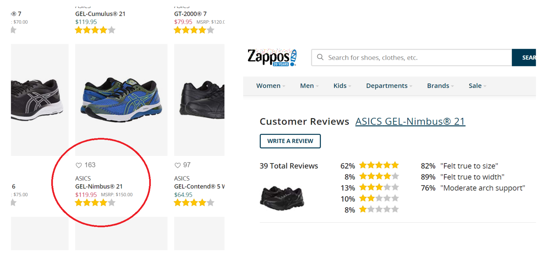 For scraping Zappos I used the automation testing framework Selenium. I was able to scrape the entire men's running shoe inventory, totaling over 500 models. The data was cleaned then loaded into a python environment to gain useful insights. Figure 1(a) shoes a web page sample. The info gathered here is brand, model, price, overall rating, and favorite likes. Figure 1(b) shows the details page where the info for total number of reviews, true-to-size, true-to-feel, and arch support were collected. Additionally customer reviews were collected for the top 4 models was collected.