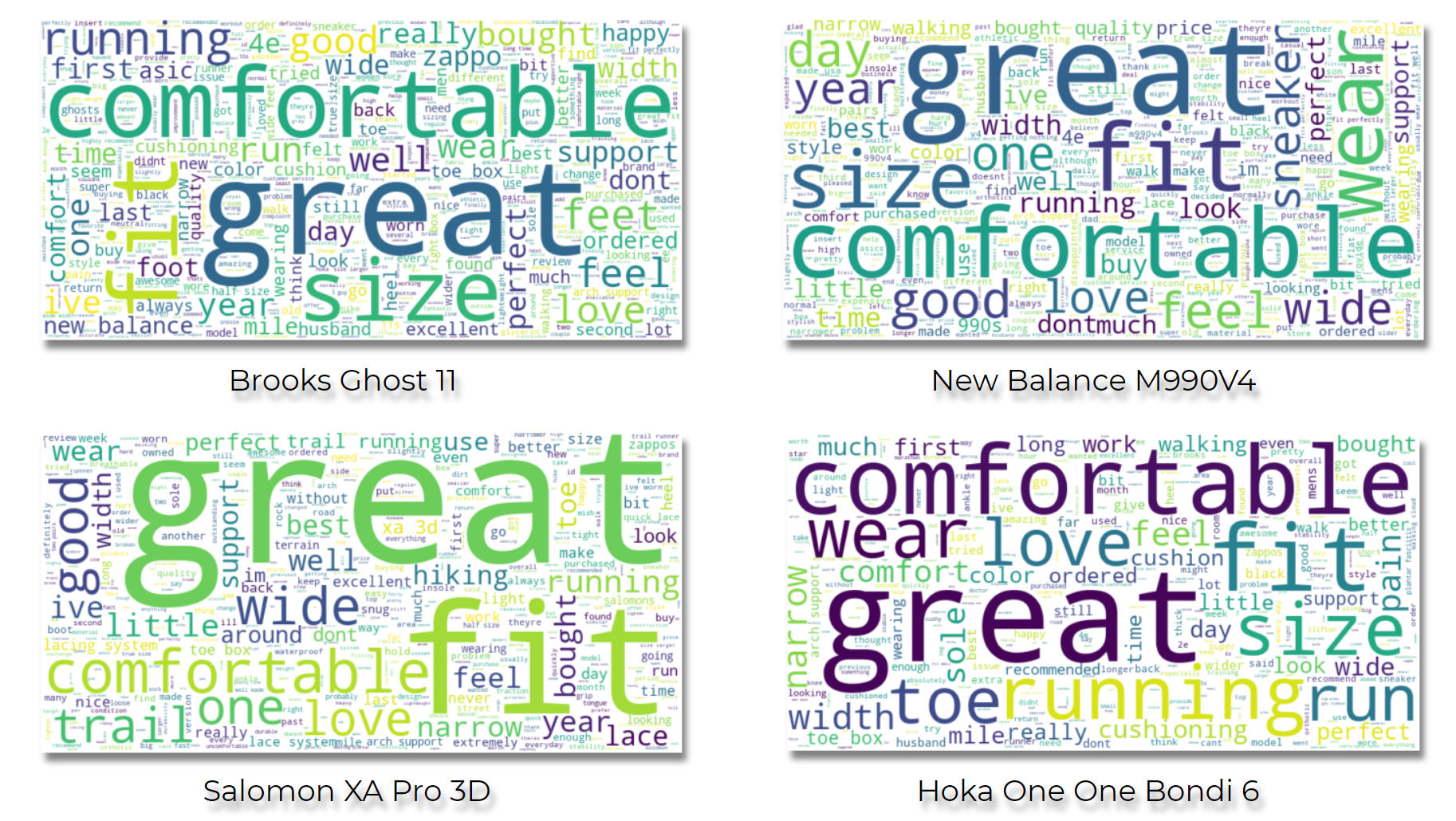 I wanted to gain insight into what customers were saying about these two top ranked shoes along with the next two following, Salomon XA Pro 3D and the Hoka One One Bondi 6. I did this by generating word clouds for each model from all of the associated customer reviews. I made sure to filter out general words, and additionally for each model I filtered out brand name and model. Figures 6(a,b,c,d) show the results respectively.