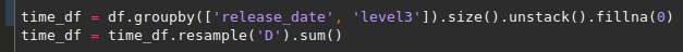 To find the best industry to work for, I needed to find industries with an upward trend of news count in the time series. To get the time series data for each industry, I had to unstack and resample the data.