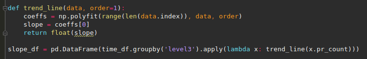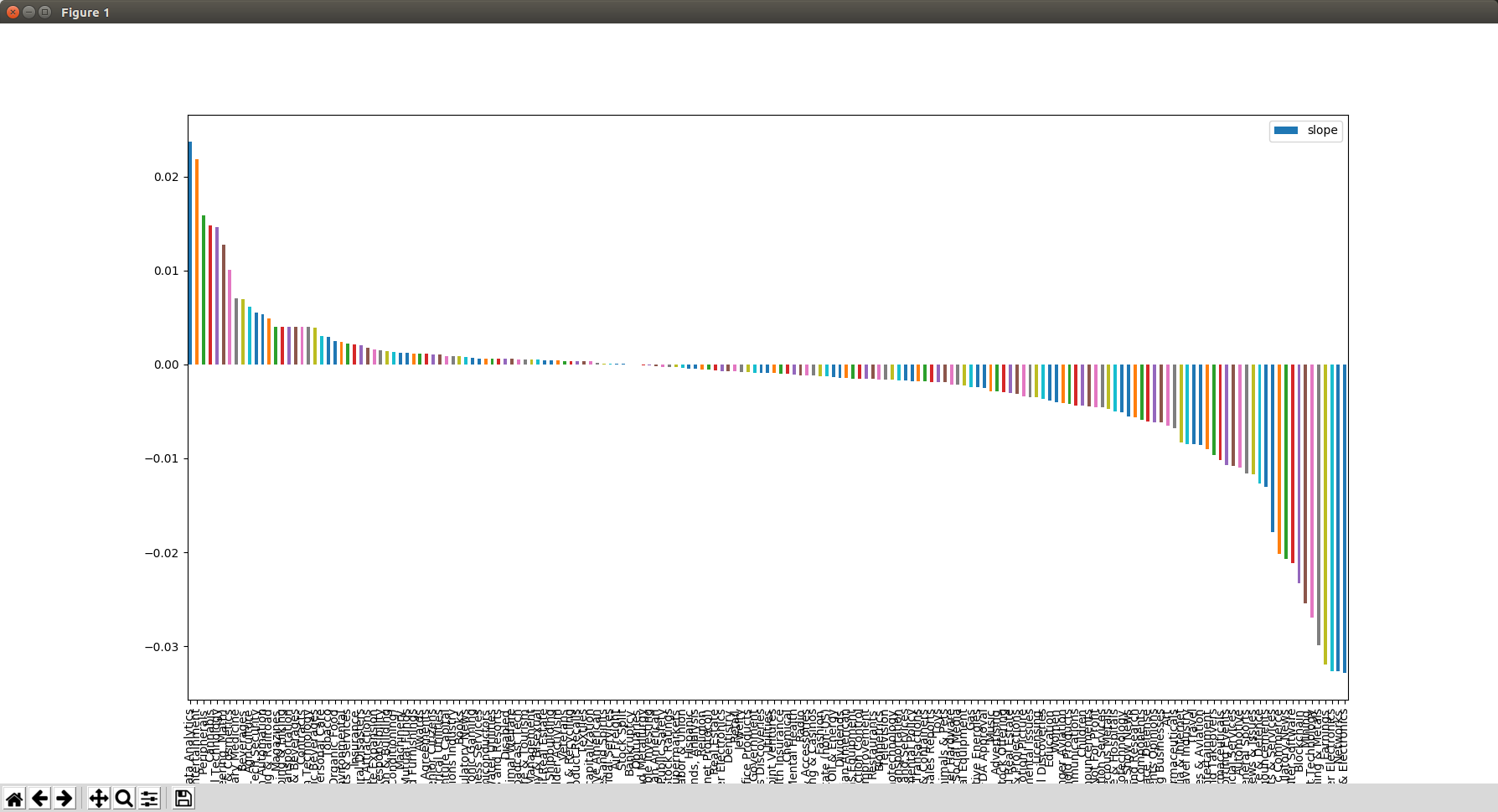 The trend_line function takes time series data frame as an argument and returns slope. If the slope is greater than 0, then the time series data have an upward trend. After applying trend_line function to all industries, I could plot trend against industries.
