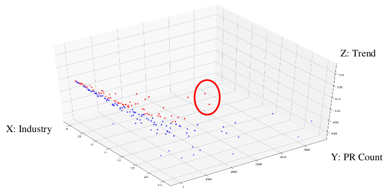 If you watch 3d plot in realtime, you can clearly distinguish that those 2 dots have high PR Count and High Trend.