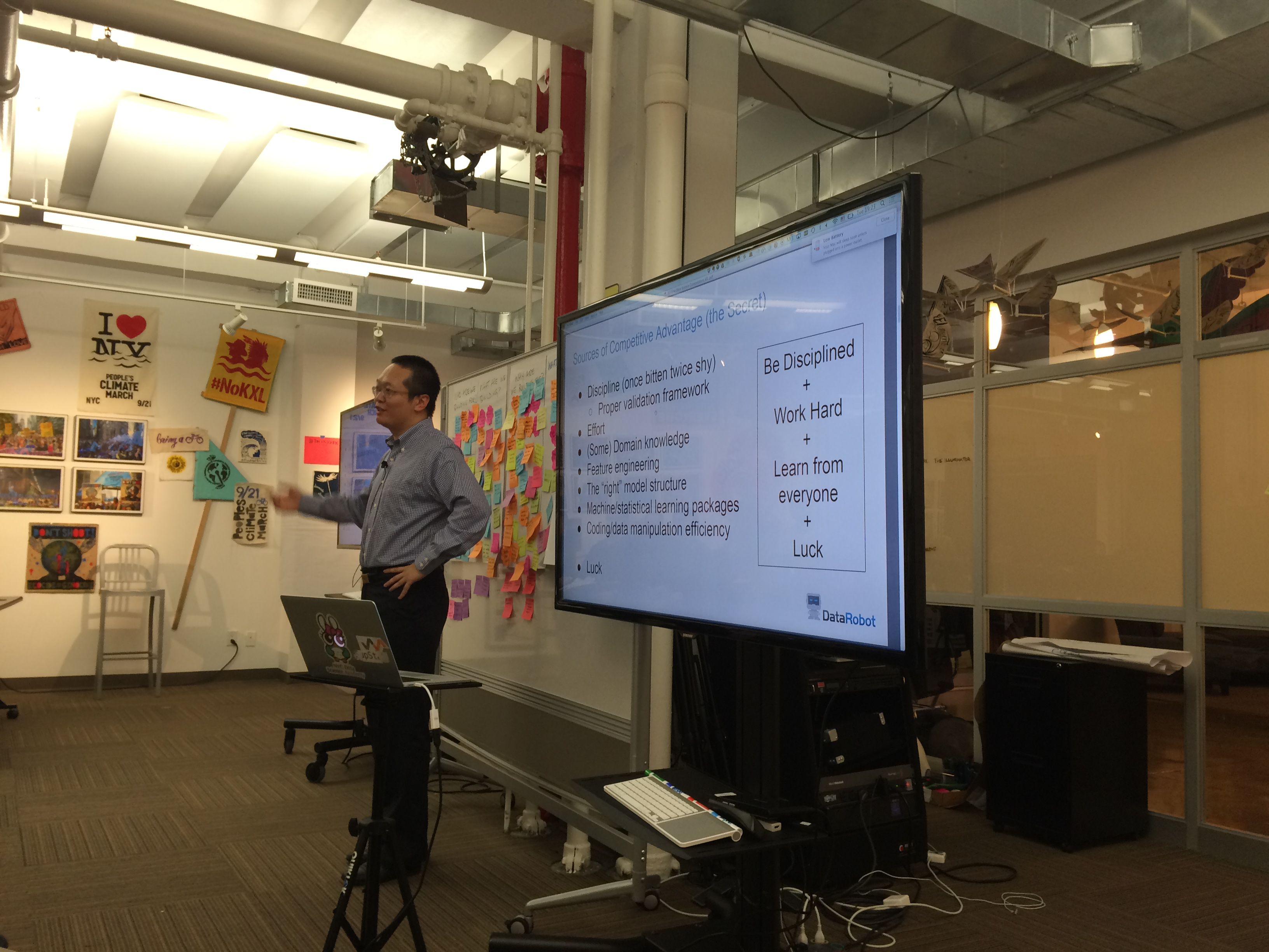 Thank you very much for coming and thanks Vivian, for the generous introduction. I’m sorry to say this, but it sounds much more impressive than it actually is. I want to tell you a little bit of background. I used to work in the insurance industry. I worked several years in Travelers and several years at AIG. So one thing that I learned from my corporate career is that it’s very very important to manage your expectations. We didn’t do a very good job, so I’m trying right now. So I’m going to give about one hour of talk. We’ll cover a few topics and I’ll cover a few topics including my personal take on how to do well in Kaggle competitions. If you have any questions, please wait until the end. We have about a half hour of open Q&A session so everybody will have a chance to ask questions.