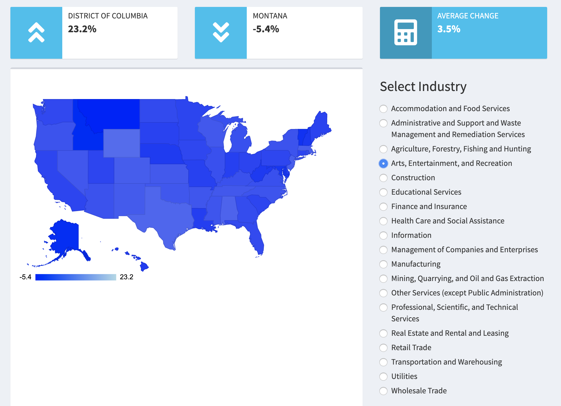 Some industries had the concentration of growth in some states (e.g. 23.2% growth in D.C. for Arts, Entertainment, and Recreation), but other industries displayed more general growth at many of states (e.g. Professional, Scientific, and Technical Services)