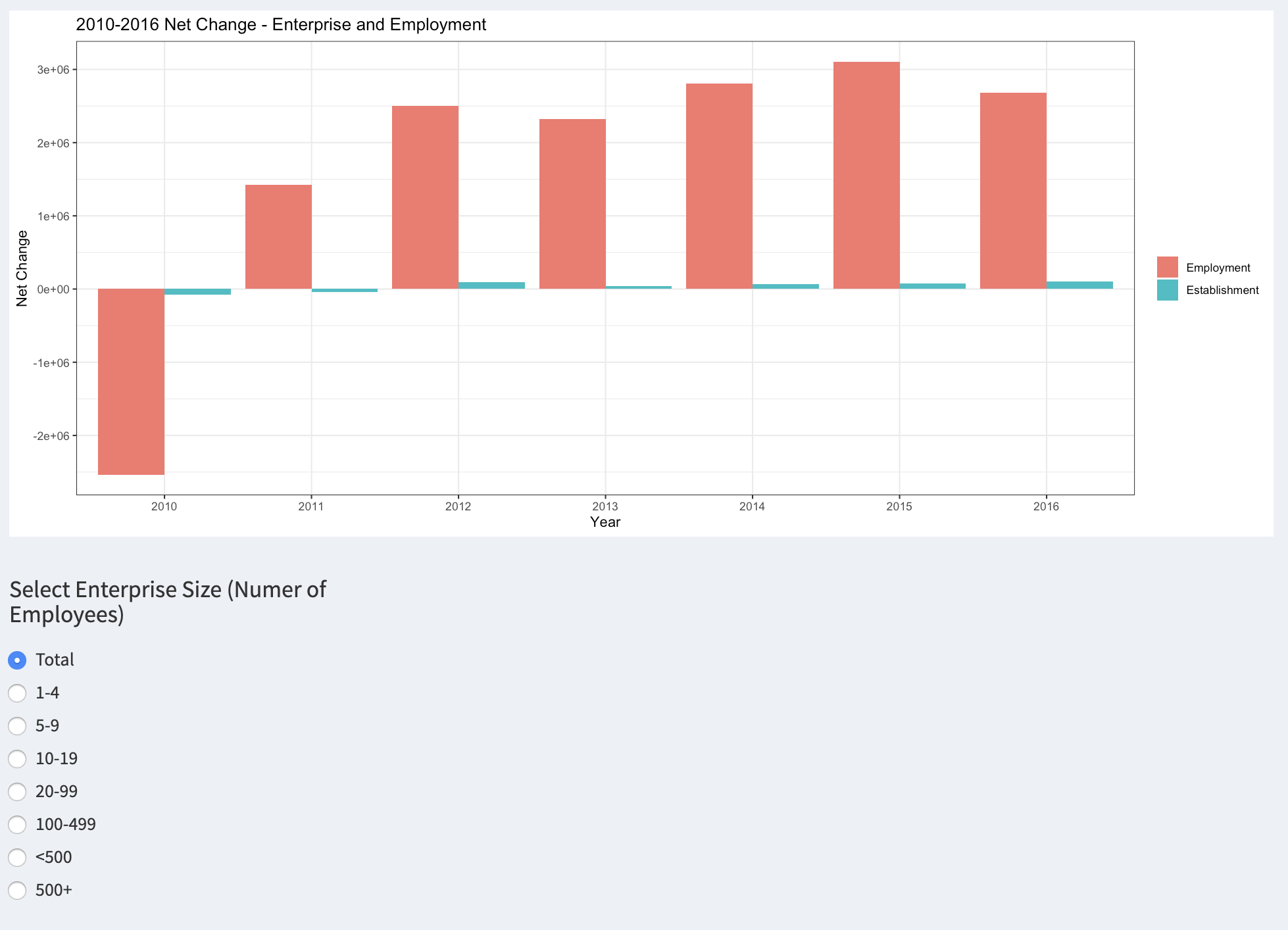 Based on the dataset from Census Bureau, "Statistics of US Business (SUSB) Employment Change Data Tables" was retrieved for the changes from 2010 to 2016.